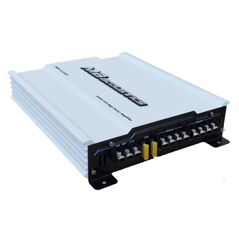 آمپلی فایر ام بی آکوستیک 4110GF چهار کاناله بهت اجازه میده ۴ عدد بلندگو رو مستقیم تغذیه کنی یا با قابلیت پلزنی (Bridgeable) بتونی اون رو به ۲ یا ۳ کانال قدرتمند تبدیل کنی و مثلاً یه جفت سابووفر یا یک ساب با دو باند رو بهش متصل کنی.