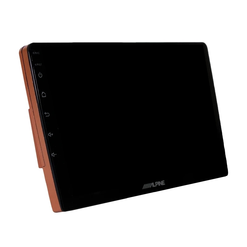 بدنه مانیتور آلپاین از پلاستیک مقاوم ساخته شده و طراحی مینیمال و مدرن دارد. لبههای باریک و صفحه شناور، تجربه کاربری راحت و زیبا ایجاد میکند. صفحه نمایش لمسی IPS ۹ اینچی با وضوح ۷۲۰p، حتی زیر نور مستقیم آفتاب هم تصاویر واضح و با کیفیت ارائه میدهد.